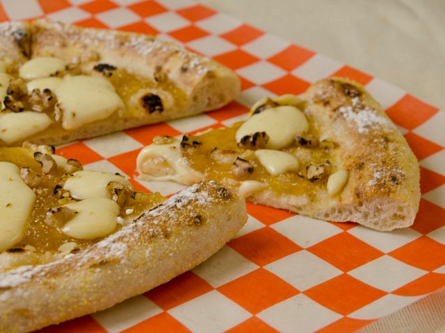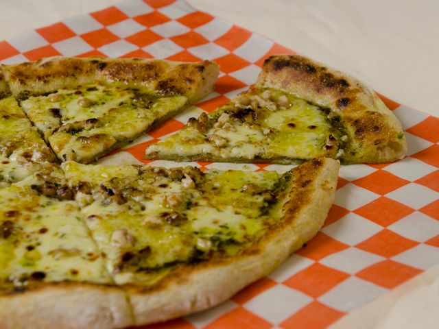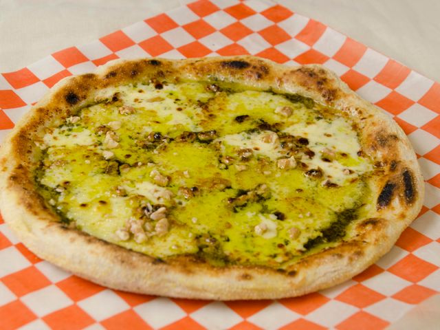 Masa fermentada 48 hs, pesto de albahaca, muzzarella, nueces, queso provolone y aceite de oliva