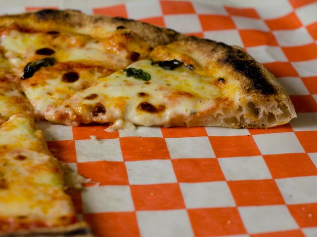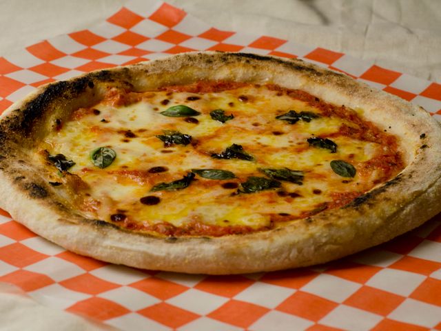 Masa fermentada 48 hs, salsa de tomates, muzzarella, albahaca fresca y aceite de oliva