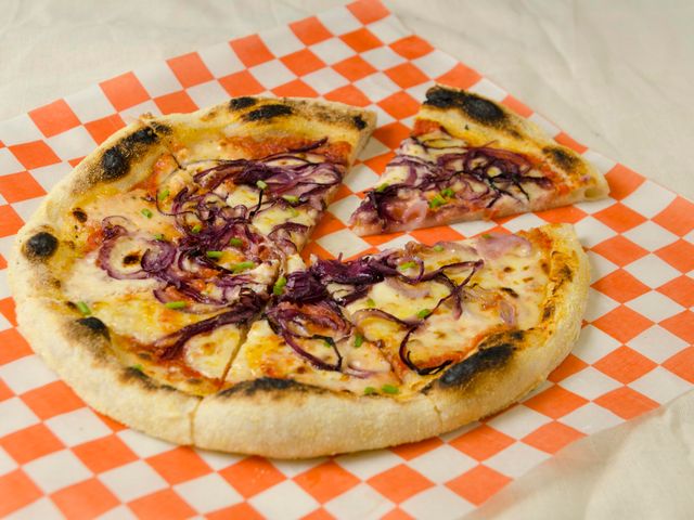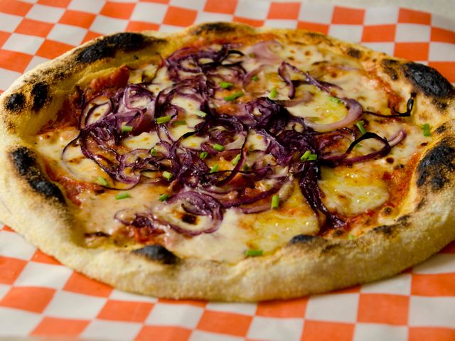 Masa fermentada 48 hs, salsa de tomates, muzzarella, cebolla morada, ciboullete fresco y aceite de oliva