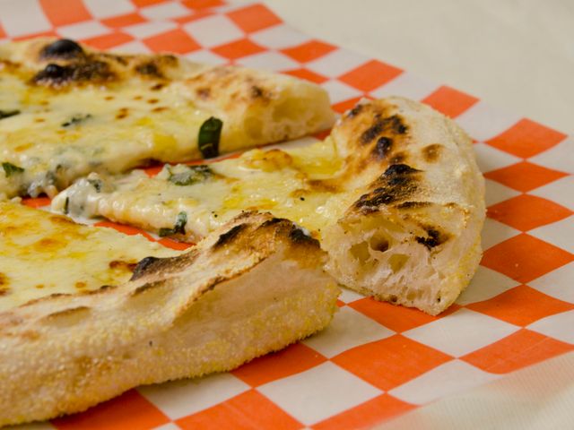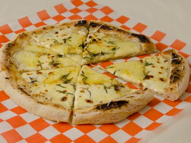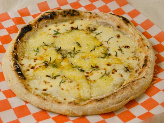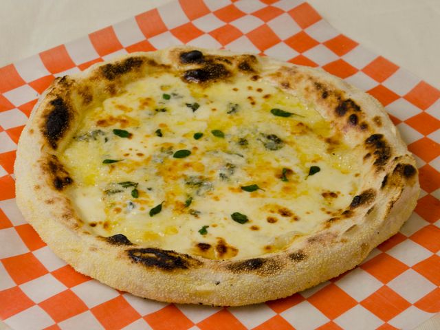 Masa fermentada 48 hs, muzzarella, queso azul, tybo ahumado, provolone, orégano fresco y aceite de oliva