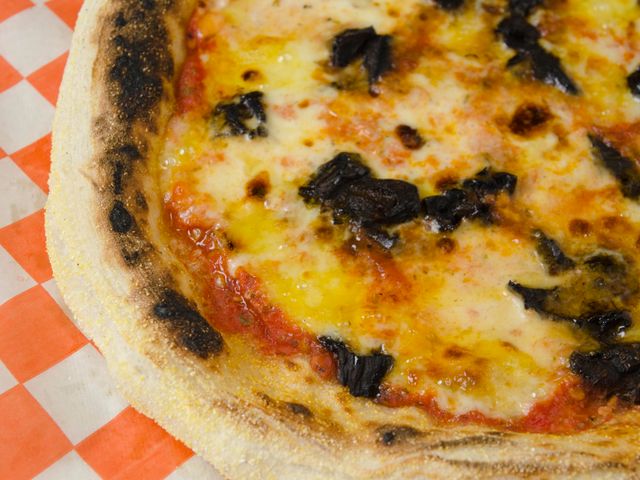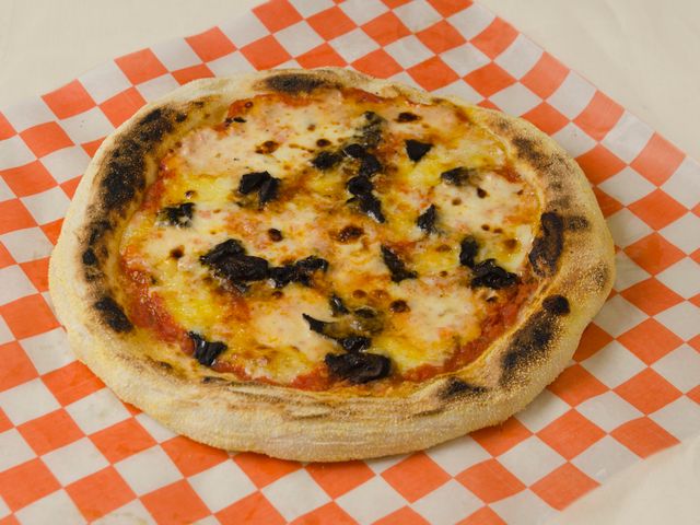 Masa fermentada 48 hs, salsa de tomates, muzzarella, hongos de pino, orégano y aceite de oliva