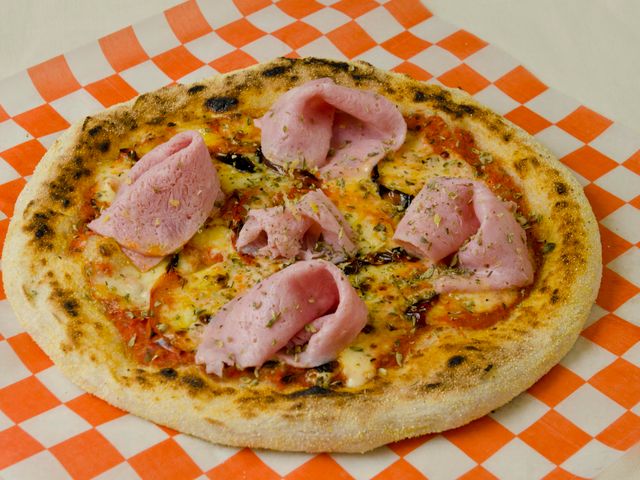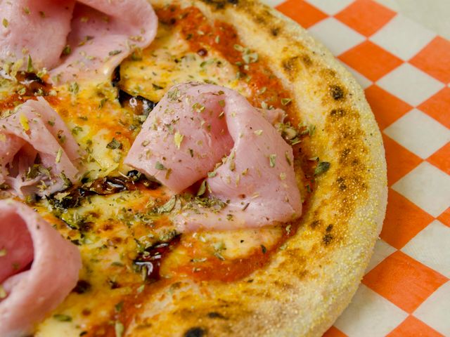 Masa fermentada 48 hs, salsa de tomates, muzzarella, morrones horneados, jamón natural, zest de limón y aceite de oliva