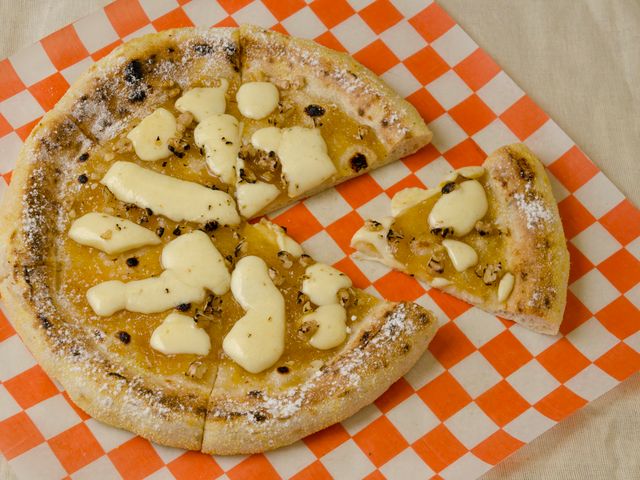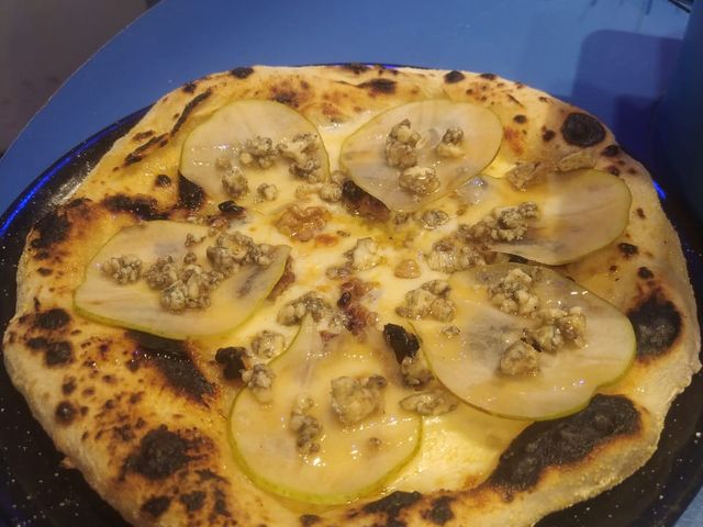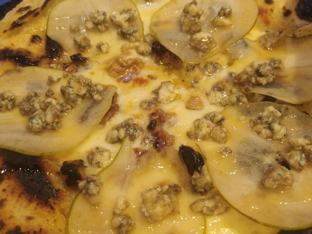 Muzzarella, peras, queso azul ahumado, nueces y salsa de miel con whisky