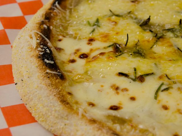 Masa fermentada 48 hs, papa cortada a 2mm, muzzarella, romero fresco, provolone, pimienta negra y aceite de oliva