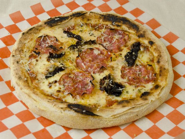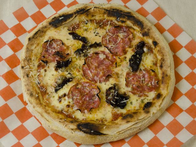 Masa fermentada 48 hs, salsa Arrabbiata, muzzarella, salame crespón, tomates secos, provolone, orégano y aceite de oliva
